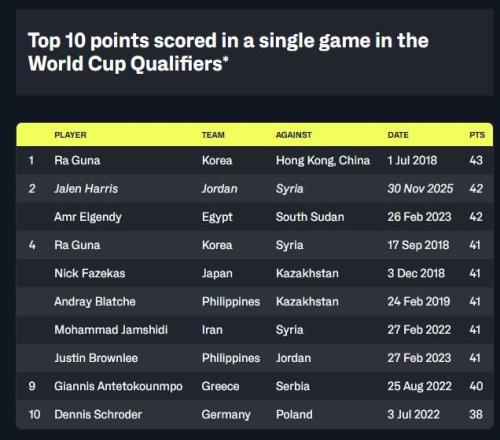 凭借单场42分的表现,27岁的哈里斯成为了2017年实行新的预选赛赛制以来世界杯预选赛单场得分第二高的球员,距离第一名罗健儿在2018年韩国对阵中国香港队时创造的43分历史纪录仅差1分。这也是迄今为止2027年世界杯预选赛的最高单场得分。此外,这也是世界杯预选赛历史上第九次出现单场40分以上的比赛。